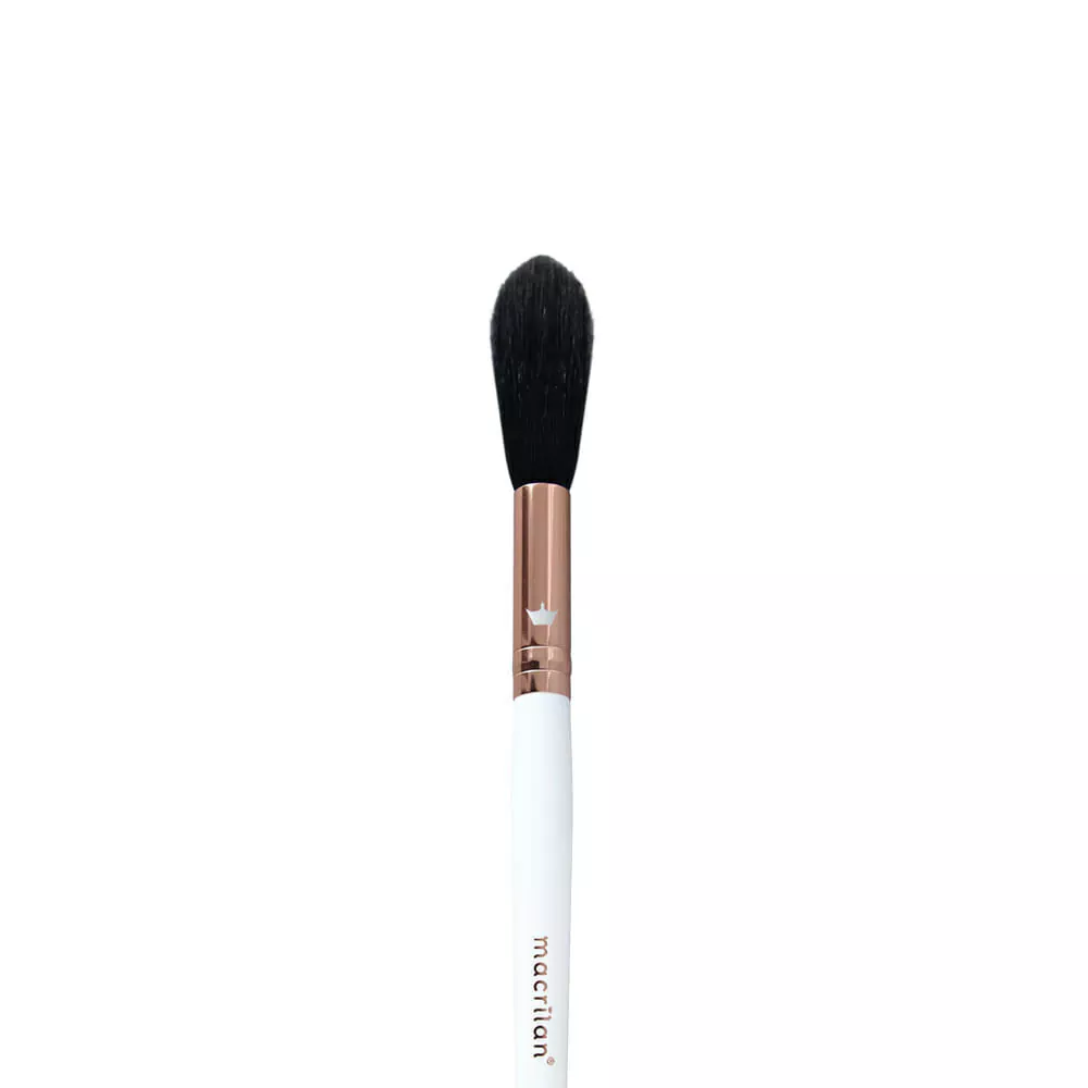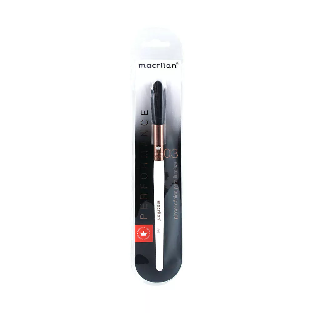 Pincel P03 Cônico para Iluminar Macrilan, especialmente desenvolvido para aplicação de iluminadores. O seu formato possibilita resultados naturais e precisos. Indicado para iluminação nas áreas do nariz, topo da bochechas, topo da boca e meio do queixo.